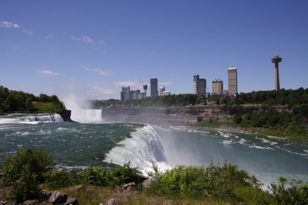 Mandag – Memorial Day – startede igen med morgenmad fra en Walmart (den mindste i USA, i hvert fald hvad mad angår, tror jeg) og så af sted mod Canada, hvor vi havde booket et hotel hjemmefra. Niagara Falls er fantastisk. Faldet skal ses fra både USA og fra Canada-siden. Man skal bestemt ikke snyde sig selv for synet fra hverken den ene eller den anden side, da udsigten er vidt forskellige fra de to sider, og kan ikke rigtigt sammenlignes. Der er tre fald i alt, som tilsammen hedder Niagara Falls og hold da op, hvor er det stort. Omkring 56 m højt og ~300 m + ~700 m bredt og godt 2,5 millioner liter vand fosser ud over kanten hvert sekund … Ufatteligt og fantastisk flot! Vi så faldene fra Canada siden mandag, hvorfra vi også var en tur med ”The Maid of the Mist” tirsdag formiddag. Om aftenen mandag, spiste vi på en god restaurant, hvor der var masser af god mad på buffet: mange forskellige salater, barbecue ribs, kylling, sushi, blåmuslinger, pizza og nogle meget søde og lækre kager til dessert mm. Lækkert! Desuden var der fyrværkeri over faldene mandag aften pga. Memorial Day. Vi så faldene fra USA siden om tirsdagen, hvorefter vi atter vente næsten hjemad mod Champaign – en køretur på omkring 13 timer (inkl pauser). En smuttur på omkring 3000 km gennem omkring 9 Amerikanske stater + Canadiske Ontario. Og igen så vi rigtig mange døde rådyr (eller hvad det nu var) liggende i siderne af vejene.